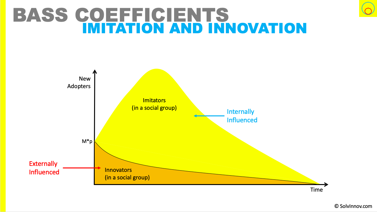 - 모방 계수(q): 기존 구매자들의 영향을 받아 새로운 소비자가 제품을 채택하는 성향.